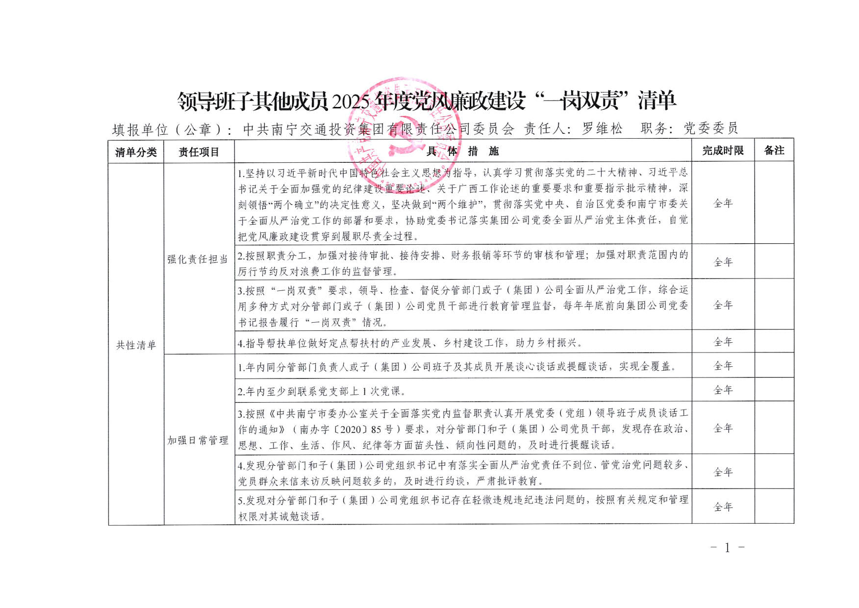 南寧交投集團領導班子其他成員2025年度黨風廉政建設“一崗雙責”清單(五)