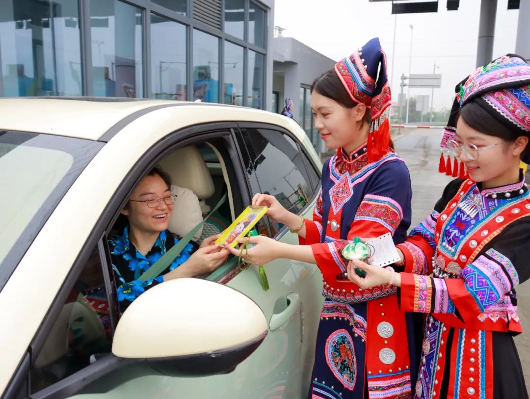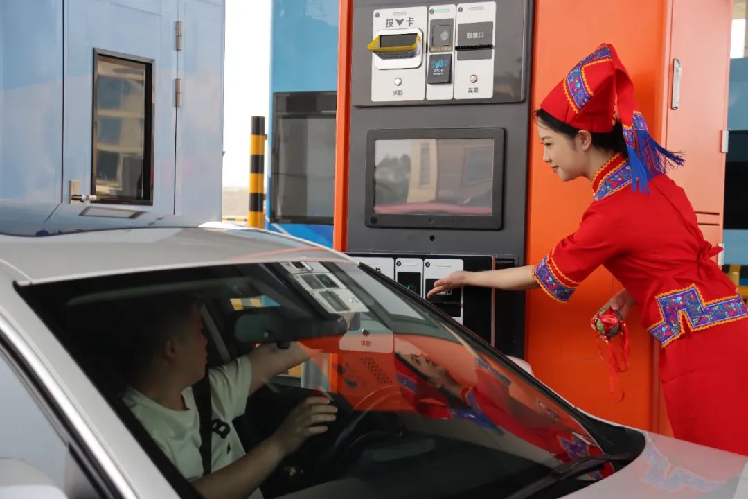 在上橫收費(fèi)總站,當(dāng)班人員身穿特色民族服裝,化身“阿哥”“阿妹”,以嶄新靚麗形象迎接廣大司乘,以?xún)A心的微笑開(kāi)展文明服務(wù),將民族特色與收費(fèi)窗口服務(wù)相融合,成為高速路上一道靚麗風(fēng)景線(xiàn)。
