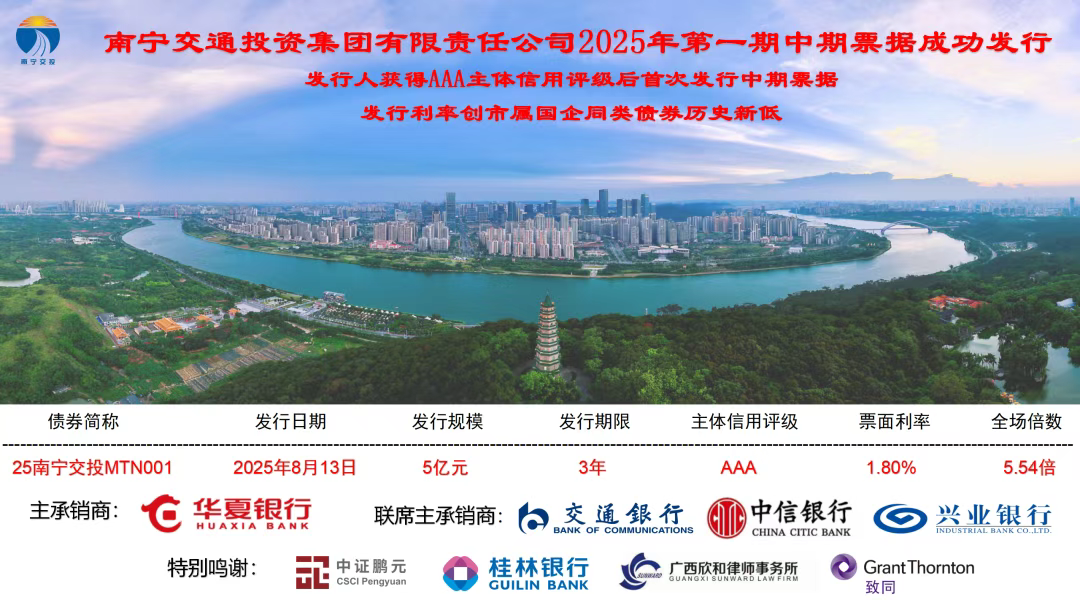 憑借良好的經(jīng)營(yíng)業(yè)績(jī)、穩(wěn)健的財(cái)務(wù)表現(xiàn)和優(yōu)異的發(fā)展前景,8月13日,南寧交投集團(tuán)成功發(fā)行2025年度第一期中期票據(jù),發(fā)行金額5億元,期限3年。