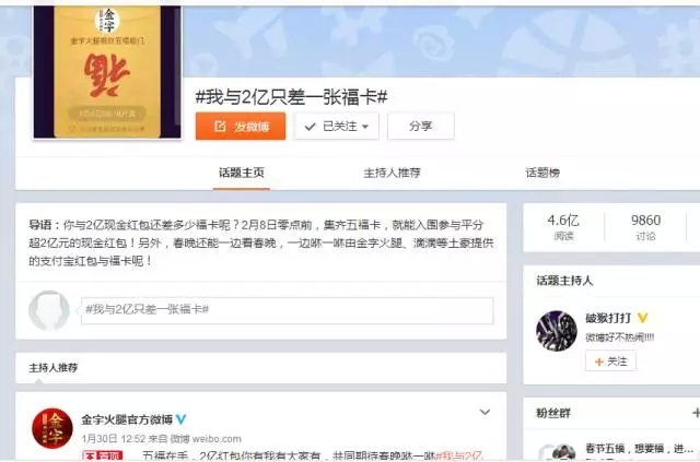 自前幾天支付寶將“集5福,搶2億+紅包”的活動規(guī)則公布后,一時間,有關(guān)??〒Q贈的話題強行霸屏。在有金字粉絲集齊了五福后,金字順勢在微博平臺上策劃的#我與2億只差一張福卡#的微話題就引發(fā)了高達4.6億的閱讀量,網(wǎng)友們通過點贊評論及轉(zhuǎn)發(fā)分享的方式,第一時間表達了自己對于五福福卡和春晚2億紅包的高度期待!